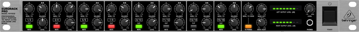 O RX1602 é um mixer de 16 inputs que em rack permite que você facilmente obtenha um som de qualidade superior. O equipamento é muito versátil e pode ser usado como mixer multiuso para performances ao vivo e projetos de gravação em estúdio, além de ser perfeito para monitorar seus projetos de gravação multitrack.