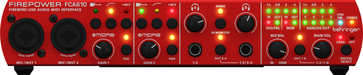 O FireWire FCA610 é uma interface de áudio USB que facilita a forma de transmitir suas gravações ou áudios de seu instrumento para seu PC ou Mac. A FCA610 suporta o Windows XP / Vista / 7 / 8 e Mac OS X e ainda fornece Phantom Power para uso com microfones condensadores. Além disso, podemos destacar que a interface possui 2 (dois) preamps Midas, marca famosa no mundo inteiro pela sua qualidade e ótimo desempenho sonoro.
