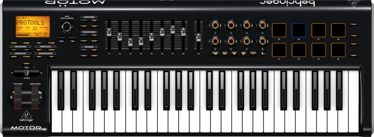 Teclado controlador USB/MIDI de 49 teclas com faders motorizados e teclas sensíveis ao toque. O MOTOR49 permite assumir o comando total sobre seus instrumentos virtuais e sua DAW (Digital Audio Workstation).