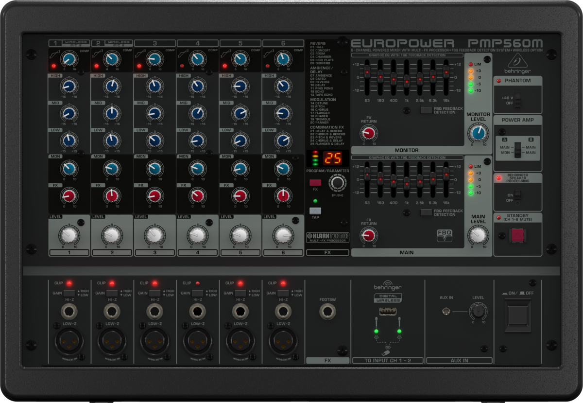 O PMP560M é um mixer digital da Behringer que proporciona melhor som com menos peso! O PMP518M oferece 500 Watts de potência, 6 canais de mixagem, processador digital de efeitos Klarkteknik, equalizador gráfico de sete bandas e a famosa tecnologia de amplificação Classe-D, que torna possível o máximo de potência com o mínimo de consumo de energia, eliminando assim a necessidade de pesadas fontes de alimentação e dissipadores de calor.