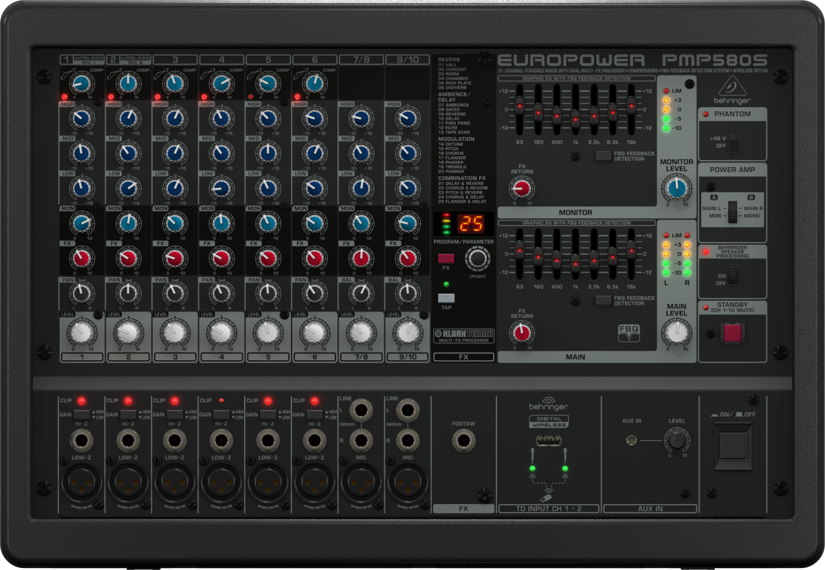 O PMP580S é um mixer digital da Behringer que proporciona melhor som com menos peso! O PMP580S oferece 500 Watts de potência, processador digital de efeitos, equalizador gráfico de sete bandas e a famosa tecnologia de amplificação Classe-D, que torna possível o máximo de potência com o mínimo de consumo de energia, eliminando assim a necessidade de pesadas fontes de alimentação e dissipadores de calor.
