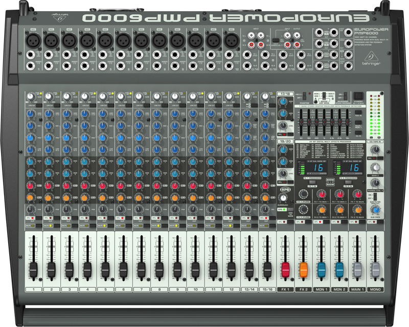 A PMP6000 é um console de mixagem da Behringer. O modelo conta com 1600 Watts de potência e sessão de mixagem de 20 canais. A console também possui dois equalizadores gráficos com feedback destroier, que podem ser usados para PA e Monitor. Além disso, o equipamento ainda conta com um processador de efeitos digital com mais de 100 presets, reverbs, chorus, delays e outros.