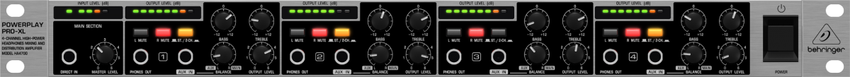 O POWERPLAY PRO-XL HA4700 é um sistema profissional de amplificador para fones de ouvido de 4 canais de alta potência para estúdio ou aplicações ao vivo. Ele proporciona a mais alta qualidade sonora com virtualmente todos os tipos de fones de ouvidos e suporta uma carga mínima de 8 Ohms mesmo em volume máximo.
