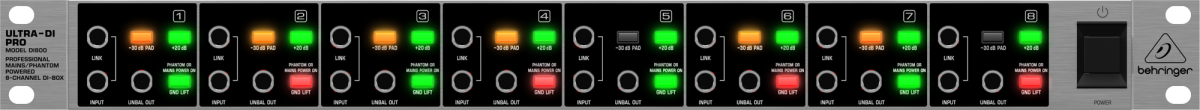 O DI800 é um direct box profissional de 8 canais da Behringer,é ativo com alimentação phantom. Ideal para aplicações ao vivo ou em estúdio, o direct box DI800 acomoda com facilidade todos integrantes da sua banda para uma apresentação perfeita.