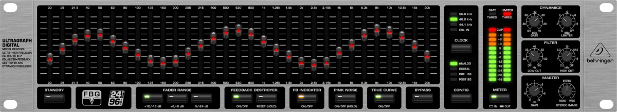 O DEQ1024 da Behringer é um equalizador gráfico de 31 bandas de fácil operação. Com dois canais In/Out, ele tem inúmeras vantagens. Com funções Noise Gate para eliminação de ruídos indesejáveis, o Limiter para proteção de seu sistema, o Feedback Destroyer para um alinhamento rápido, Pink Noise para um alinhamento preciso, conexão AES/EBU e S/Pdif para maior fidelidade do áudio transmitido, indicador de Feedback para auxiliar cortes de frequências em caso de realimentação, funções Low Cut e High Cut para facilitar cortes de frequências extremas e Stereo Image para uma projeção de ambiente totalmente estéreo, o DEQ1024 é perfeito para as mais diversas aplicações!