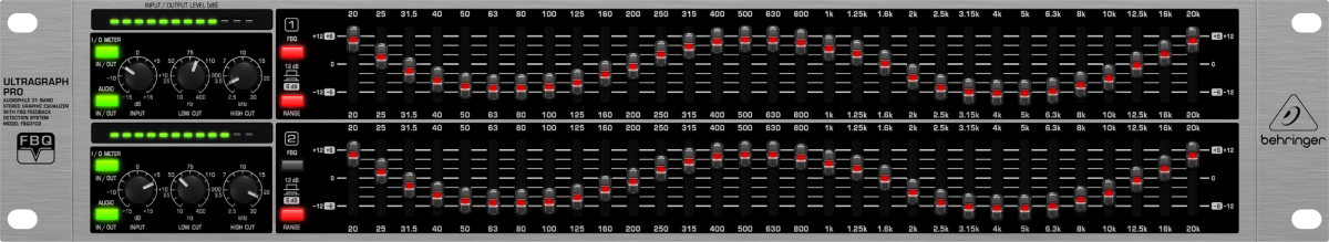 Sistema FBQ de anti-microfonia que revela instantaneamente frequências críticas e também pode ser usado como analisador de áudio;