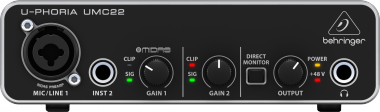 A UMC22, da Behringer é uma interface de áudio compacta que lhe permite gravar vocais ou intrumentos com perfeição diretamente no seu computador, graças aos Preamps MIDAS reconhecidos mundialmente. Possui 2x2 e 48kHz USB. Ela foi projetada com alimentação Phantom Power 48V para microfones condensadores e conversor com amostragem de estúdio de 48 kHz para uma qualidade de som excelente. Se você é um cantor, compositor, produtor em movimento, ou apenas precisa de uma interface sólida para a execução de faixas de apoio no show, a sua melhor opção é a U- phoria UMC22.