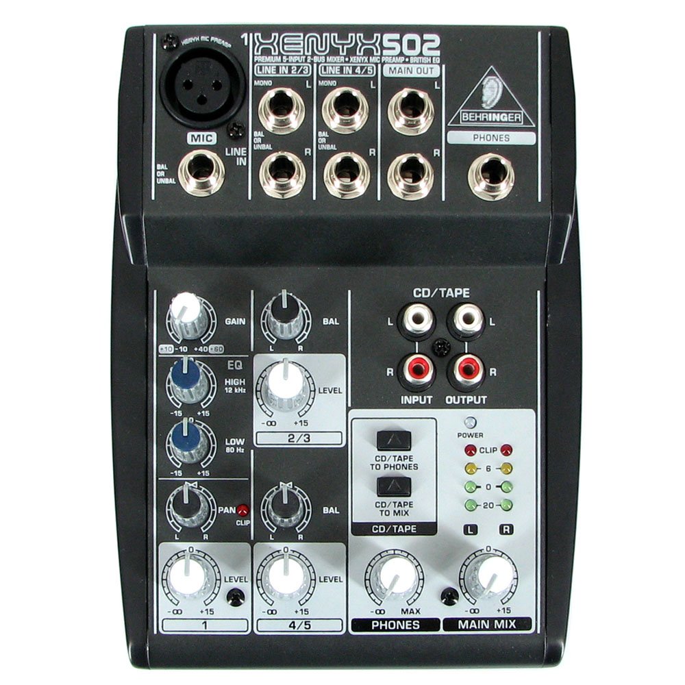 O Xenyx 502 da Behringer é um mixer analógico Premium de 5 entradas com pré-amplificadores de microfone XENYX. Ela possui ainda equalizadores "britânicos" de 2 bandas e entradas de CD RCA atribuíveis a saída de fone de ouvido ou saídas do mixer principal. Há um entrada mic e as entradas 2/3 e 4/5 são estéreo para uso com teclado ou outros dispositivos reprodutores. Uma entrada/saída estéreo adicional pode ser utilizada para conectar a dispostivos de CD e fita. O mixer apresenta um design ultra compacto, perfeita para projetos de gravação, edição de vídeo e pequenos sistemas de P.A.
