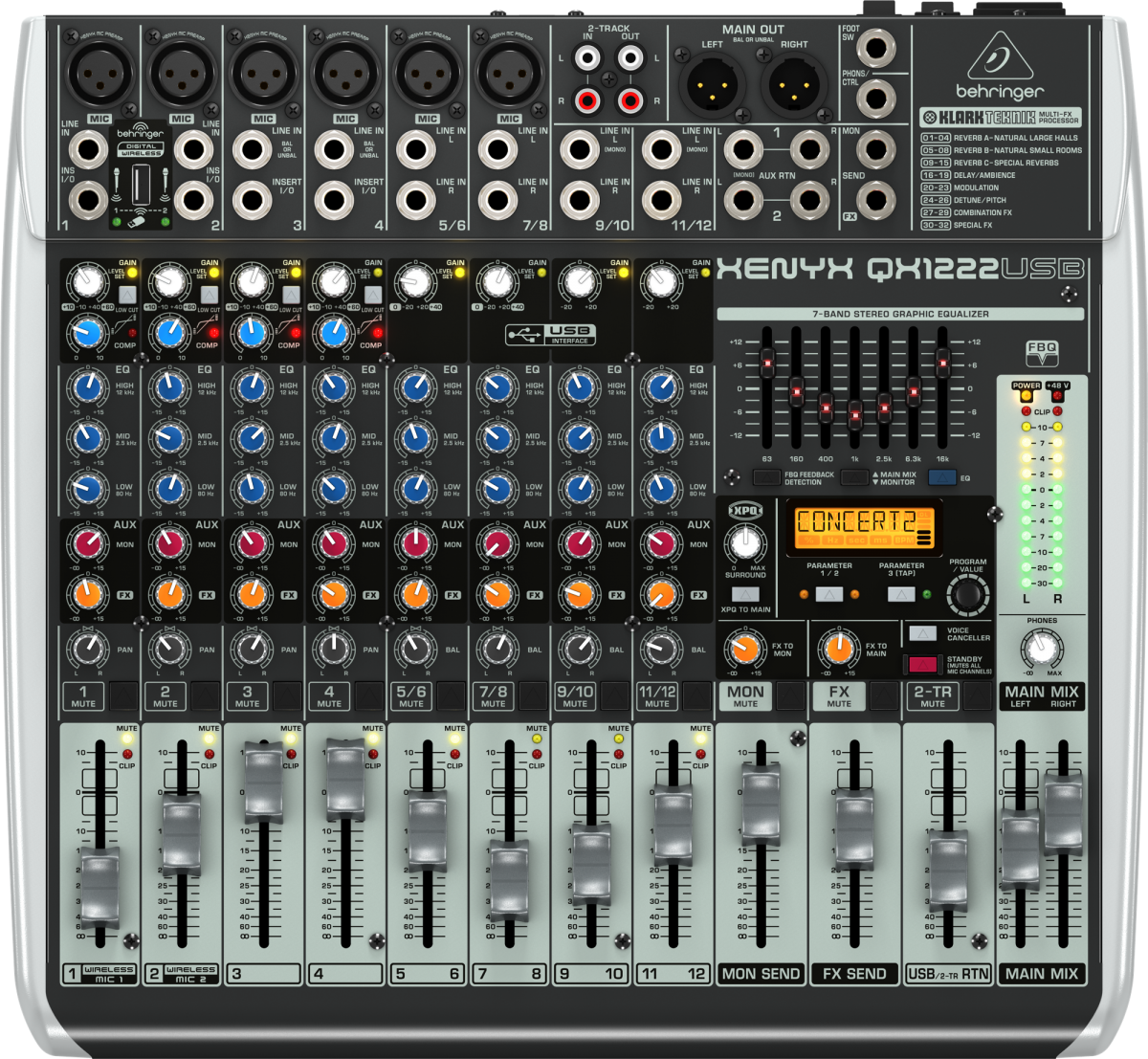A mesa de som Xenyx X1222USB da Behringer é um mixer analógico de baixíssimo ruído e grande headroom, equipado com pré-amplificadores para microfone Xenyx de altíssimo desempenho, comparáveis a pré-amplificadores de grande renome. Possui ainda compressores de estúdio "One-Knob" de fácil uso com um único potenciômetro em todos os canais mono. A mesa de som Xenyx X1222USB têm EQs de 3 bandas estilo “britânico” e um novo processador de efeitos para estúdios com 16 presets editáveis incluindo reverb, chorus, flanger, delay, pitch shifter, multi-efeitos, função Tap e configuração de parâmetros do usuário armazenáveis.