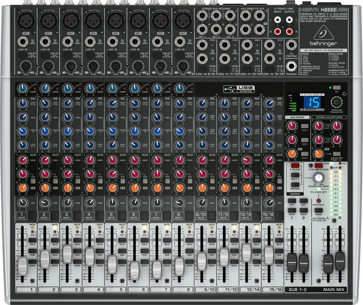 A mesa de som Xenyx X2222USB da Behringer é um mixer analógico de baixíssimo ruído e grande headroom, equipado com pré-amplificadores para microfone Xenyx de altíssimo desempenho, comparáveis a pré-amplificadores de grande renome. Possui ainda compressores de estúdio "One-Knob" de fácil uso com um único potenciômetro em todos os canais mono. A mesa de som Xenyx X2222USB têm EQs de 3 bandas estilo “britânico” e um novo processador de efeitos para estúdios com 16 presets editáveis incluindo reverb, chorus, flanger, delay, pitch shifter, multi-efeitos, função Tap e configuração de parâmetros do usuário armazenáveis.