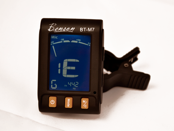 Modo de afinação: cromático (C), violão/guitarra (G), baixo (B), violino (V);