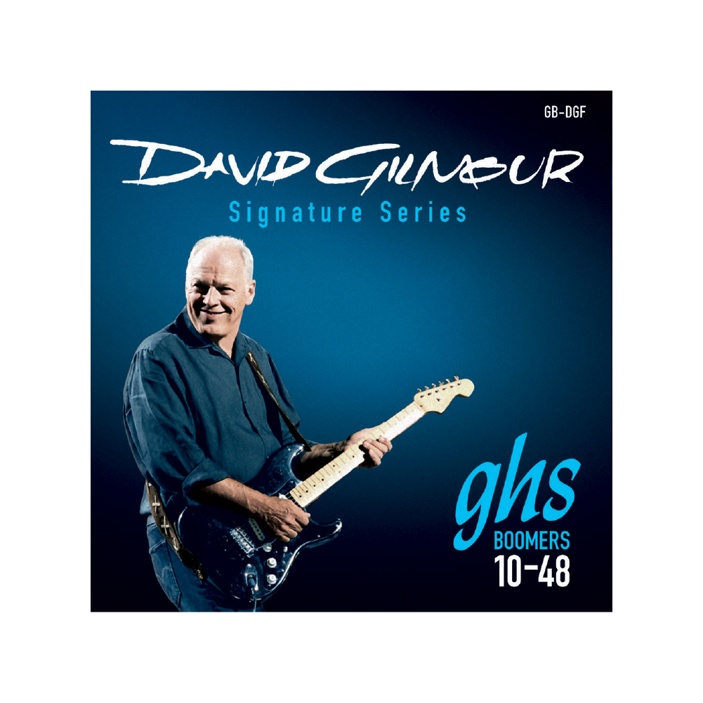 GB-DGF - Encordoamento 6 cordas para guitarra (010-048). Acabamento em Níquel, signature David Gilmour. A conexão de David Gilmour com a GHS remonta a 1979, quando ele começou a usá-las no projeto "The Wall" do Pink Floyd. Ele usa as medidas 10, 12, 16, 28, 38 e 48 em sua Stratocaster e 10.5, 13, 17, 30, 40 e 50 em sua Les Paul.