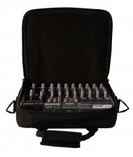 Bag para mixer 20” x 20” construída em nylon resistente. Superfície exterior áspera e revestimento interior com dupla camada de espuma de 10mm. Alça de ombro ajustável e removível. Alças de mão com membrana para maior conforto. Fechamento com zíper e compartimento externo para acessórios e cabos.
