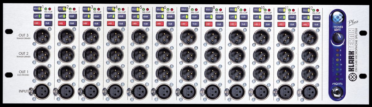 12 canais splitter sendo 2 eletronicamente equilibrados e 2 saídas de transformador balanceadas por canal;