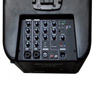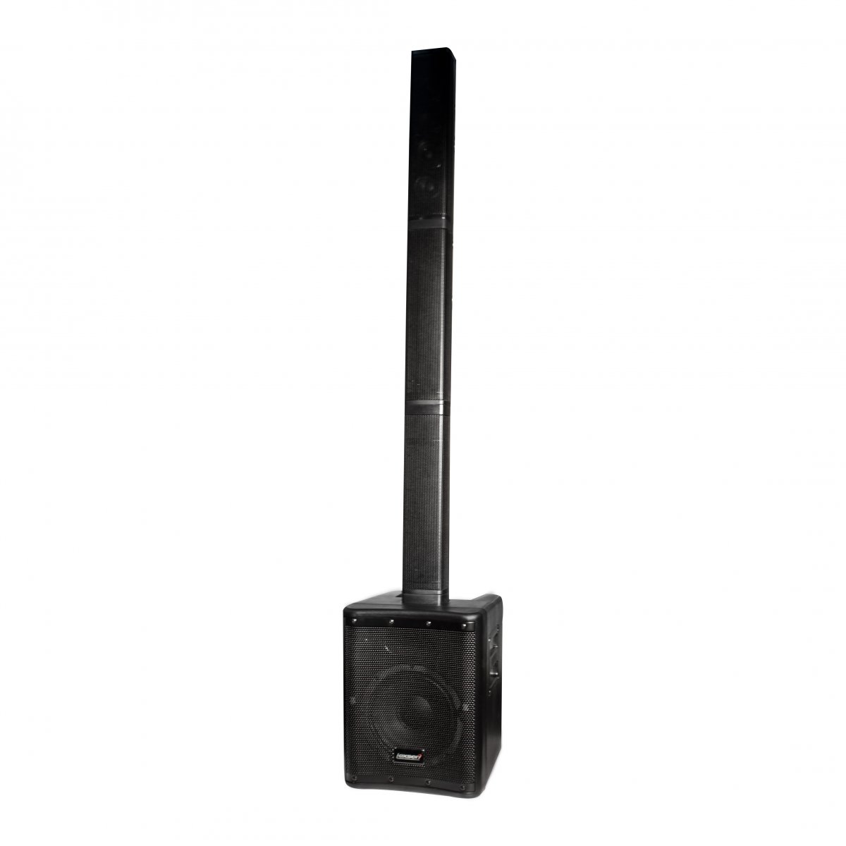 O sistema é composto por uma torre com 4 alto falantes full-range de 2,75” e um subwoofer de 8” com amplificador classe D. Com 600W RMS e sensibilidade de 118dB, ele oferece uma potência impressionante para seu tamanho.