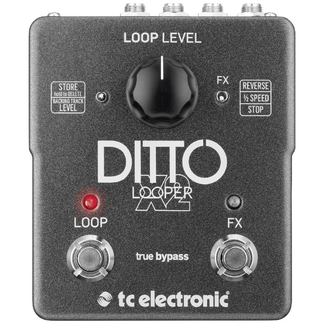 Sem dúvida, o TC Electronic Ditto Looper é um dos mais populares pedais looper já lançados. O Ditto Looper é tão popular, que a TC Electronic lançou um ano mais tarde o incrível Ditto Looper X2. O Ditto Looper X2 possui a mesma utilização simples de seu predecessor, mas também inclui efeitos interessantes de Loop, incluindo Half Speed (metade da velocidade), Reverse Loop, ou ambos. O pedal ainda possui conectividade USB que permite que o usuário importe e exporte Loops a partir do seu computador, aparelho de som estéreo I/O lhe dá toneladas de flexibilidade e configurações, e o usuário ainda consegue armazenar e reproduzir até cinco minutos de áudio de 24 bits no TC Electronic Ditto Looper X2.